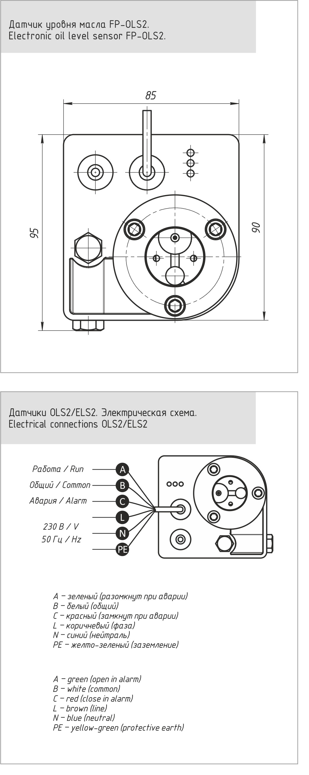 | FP-OLS2 | 4.5 | 5.0 | 230 V; 50 Hz; 0.04 A | IP67 | 230 V; 50 Hz; max 3 A | 120 sec (Alarm) | 2 m |