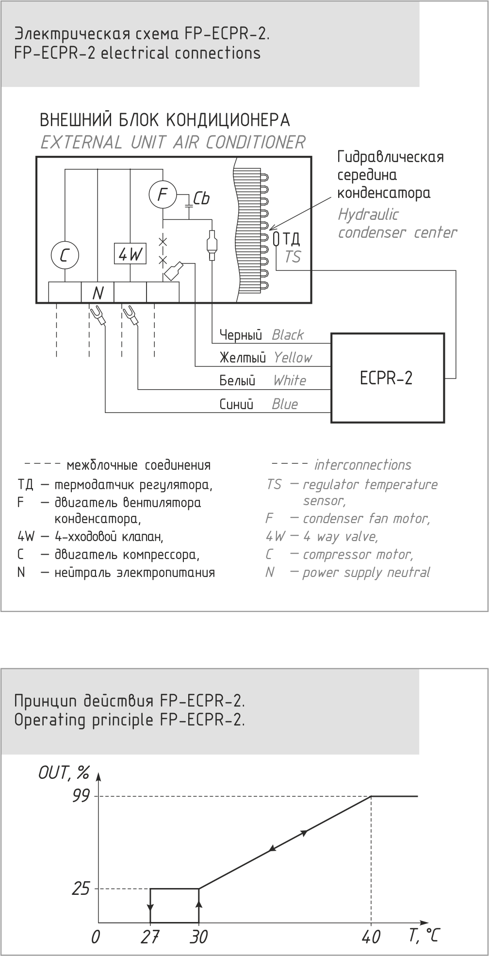 The FP-ECPR-2 regulator is designed to maintain a certain level of condensation pressure in split air conditioning systems. It is mainly used in split systems that operate in a wide range of outdoor temperatures. FP-ECPR-2 ensures reliable operation of the air conditioner in the cold in the winter by changing the speed of the condenser fan in the range from 0 to 100 percent.