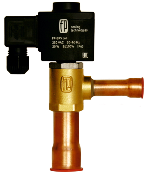 FP-ERV15 представляет собой пилотно управляемый расширительный вентиль с импульсной катушкой 230В переменного тока. Открытие осуществляется за счет подачи напряжения на катушку, закрытие путем его снятия, рекомендуемый период открытия-закрытия 6 секунд. Ниже приведено устройство и описание принципа работы FP-ERV15: